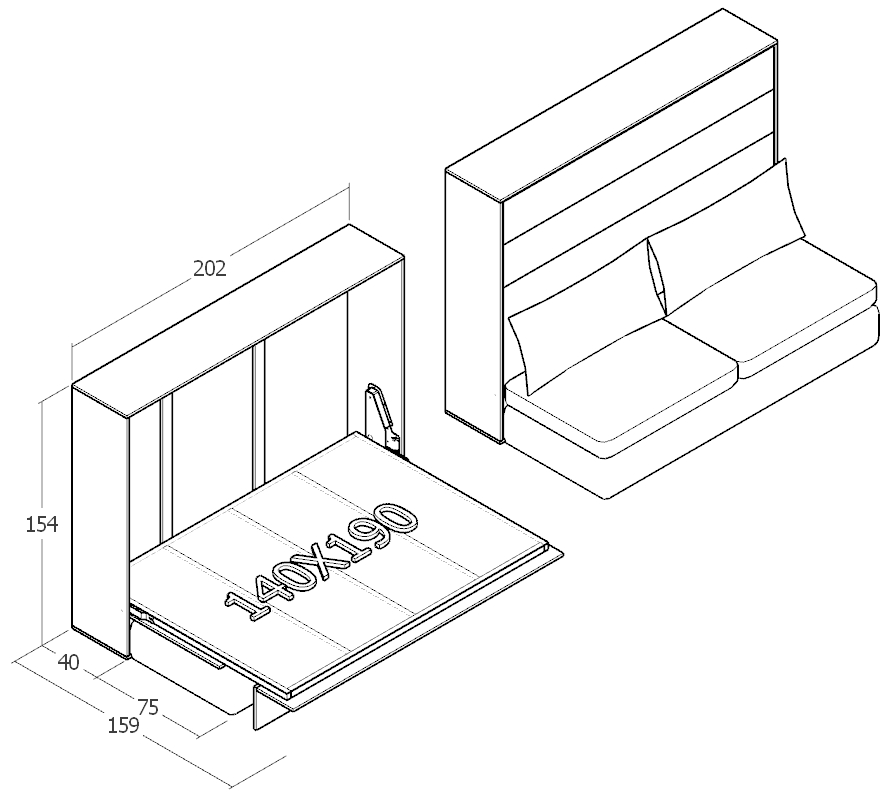 140x190 çift kişilik duvar yatağı kapalı hali, katlanır yatak sistemi modern tasarım sandıklı model
